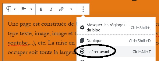 Insérer un nouveau bloc avant ou après le bloc actuellement sélectionné